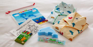 カラーやデザインが異なる4タイプの客室があり、お子様用のパジャマやステップなどはもちろん、小学生以下のお子様にはフリッパーズバッグもご用意しています。